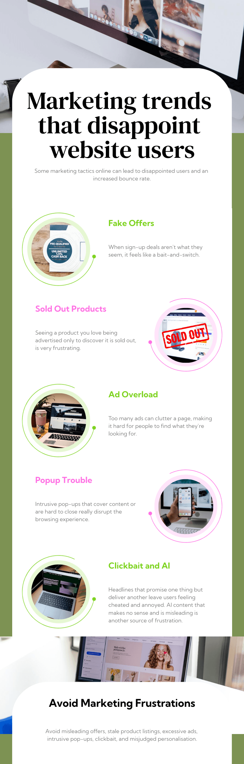 Not all marketing techniques are equal, and some are sure to leave your website users disappointed or frustrated. Some of the common trends that have this unfortunate effect include: